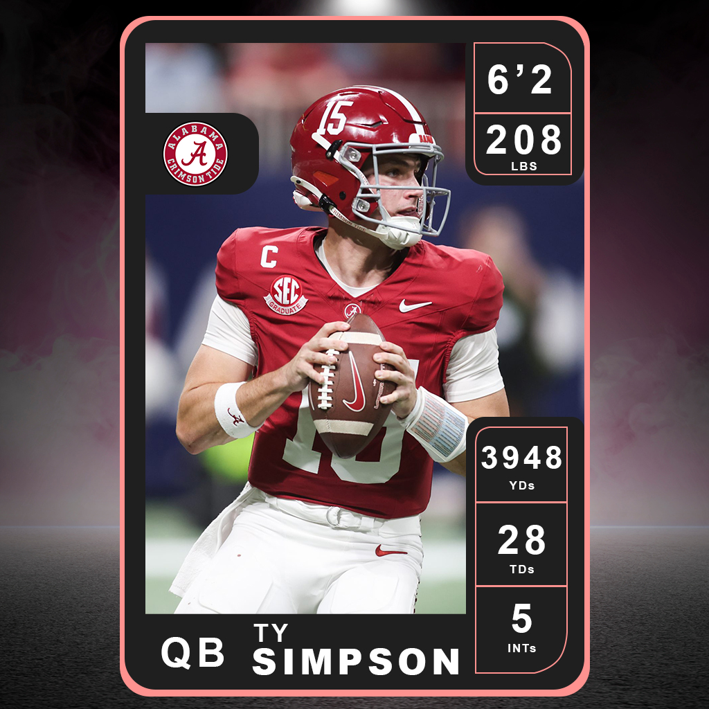 Avec Ty Simpson, nous avons là encore un profil de Quarterback somme toute atypique. Recruté par Alabama en 2022, il passe ses 3 premières années sur le banc (dont 2023 et 2024 derrière Jalen Milroe), sans transférer, en restant fidèle et en attendant son heure. A force de patience et de travail, Ty Simpson l’a eu son opportunité, sur cette saison 2025.
